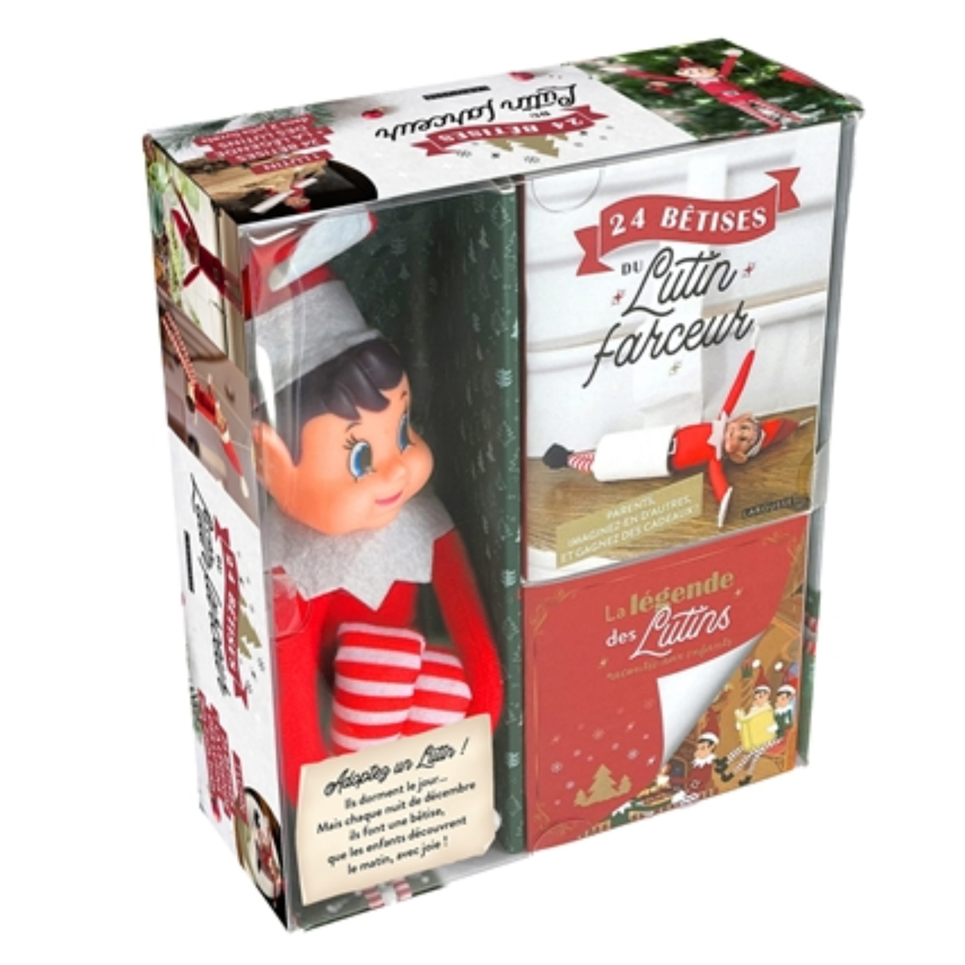 Coffret contenant le matériel nécessaire pour ponctuer l'Avent de magie, avec un lutin tout rouge et 24 bêtises à mettre en scène.