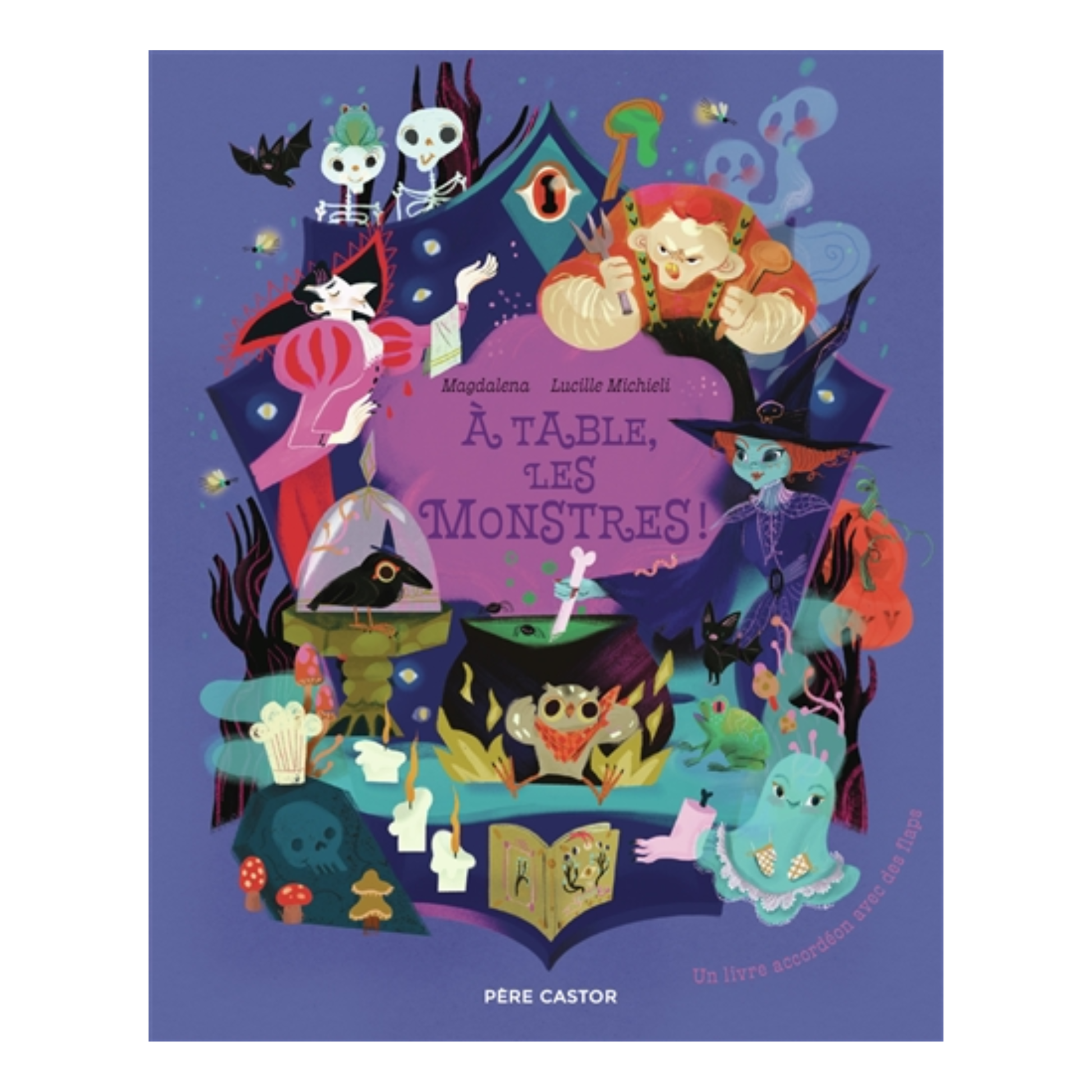 Ce soir, dans la forêt sombre, chaque monstre prépare son plat préféré. La sorcière envoie son corbeau pour découvrir ce qu'ils mijotent : un ragoût de hiboux, un gâteau à la bave de crapaud, des friands de cafards, etc. Un livre accordéon avec des flaps à soulever.