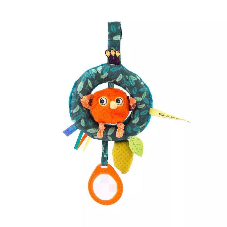 Orné de motifs tropicaux, il intègre un prisme, des petits gris-gris et des feuilles pour captiver l’attention de bébé. Au centre, un poussin orange posé comme sur une balançoire apporte une touche ludique. Facile à fixer au parc ou à la poussette, ce jouet textile est un choix idéal pour accompagner l’éveil des nourrissons, et constitue un cadeau de naissance raffiné.