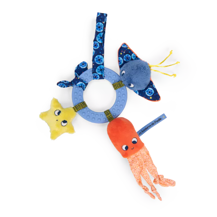 Découvrez l'anneau d'activités de la collection Les aventures de Paulie de Moulin Roty, un jouet à suspendre sur le thème de la mer pour divertir et éveiller les sens de bébé dès ses premiers mois.