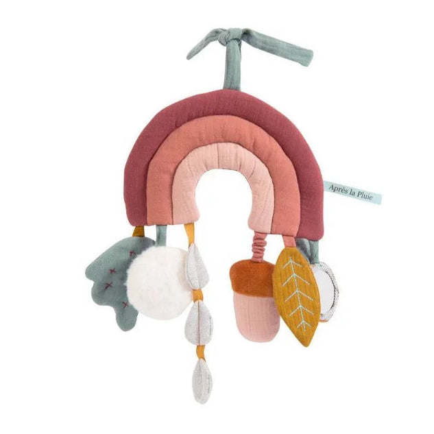 Découvrez l'arc-en-ciel d'activités de la gamme Après la pluie de Moulin Roty, un jouet d'éveil en tissu aux teintes automnales, équipé de attaches pour le fixer au lit, au cosy ou à la poussette.