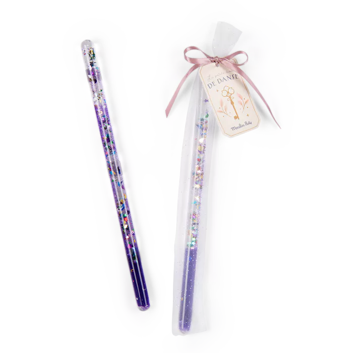 Découvrez la baguette magique violette de la collection La petite école de danse de Moulin Roty , une baguette présentée dans un sachet en tulle noué d'un fil satin.