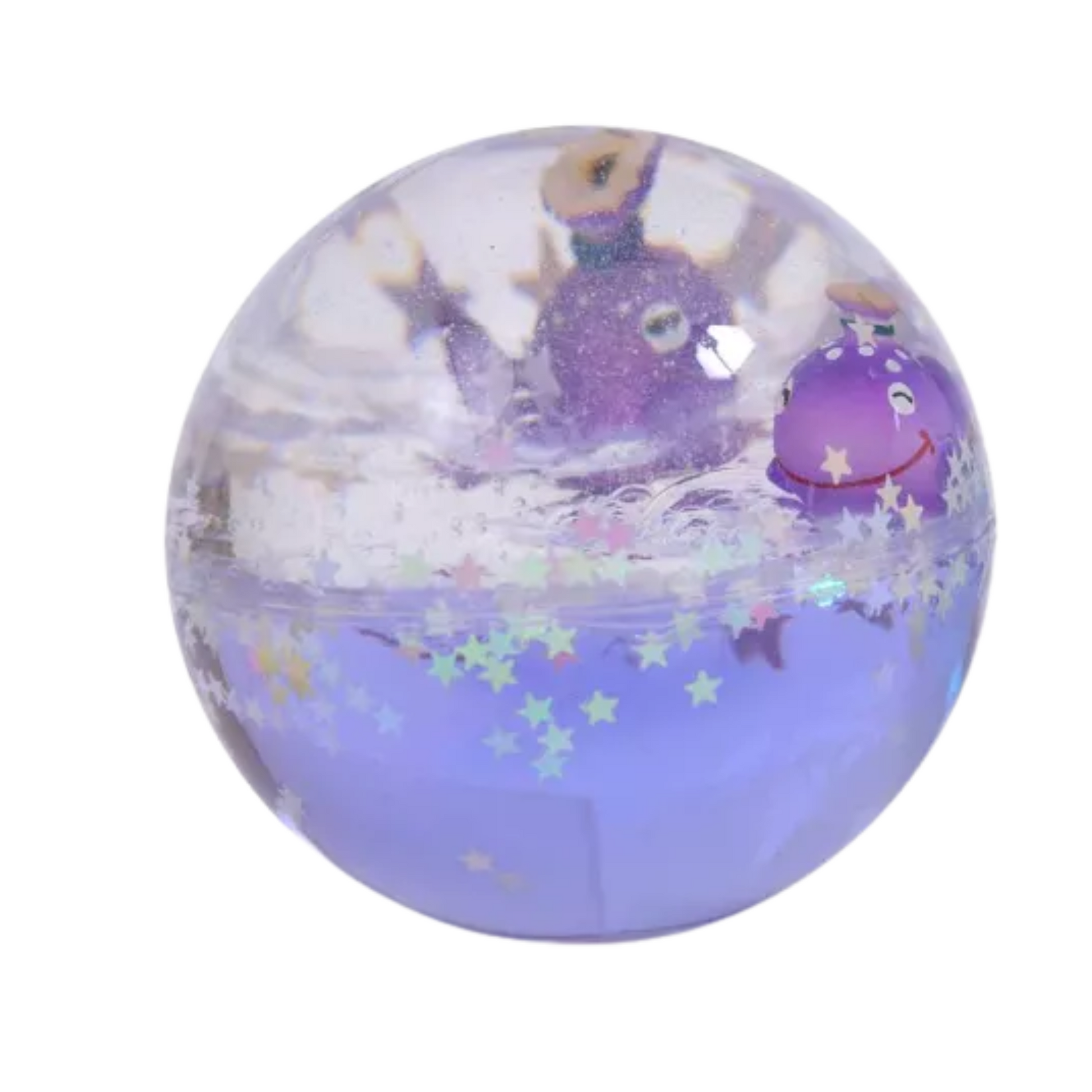 Balle rebondissante remplie de liquide coloré, où l'on voit une baleine se baigner au milieu d'étoiles brillantes!