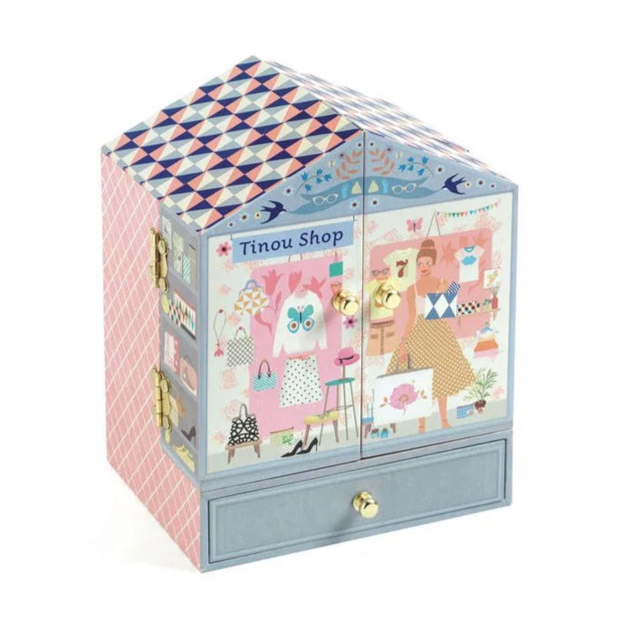 La boîte à bijoux Tinou Shop de Djeco allie élégance et fonctionnalité. Ce coffret musical en bois, orné de papier décoratif, comprend trois tiroirs pour organiser bijoux et petits trésors.