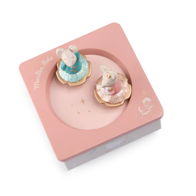 De petites souris danseuses tournent gracieusement sur la scène pour apaiser et endormir votre bébé. En activant le mécanisme sous la boîte, observez les figurines virevolter au son de la mélodie.