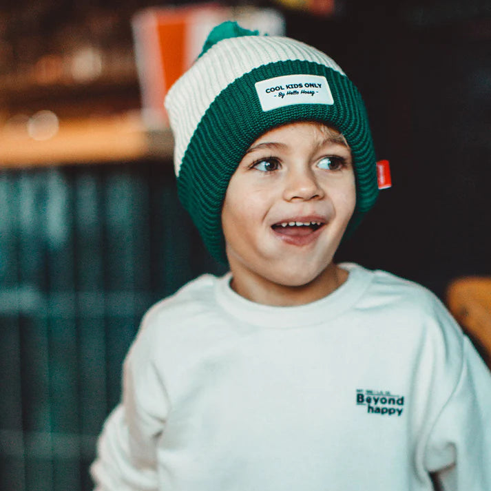Le Bonnet pour enfants Color Block Hope est un modèle passe-partout. Bonnet à porter en famille ! Coton biologique certifié Oeko-Tex, doublure polaire, bonnet avec pompon, c'est le cadeau idéal pour les enfants et les familles.
