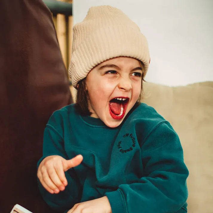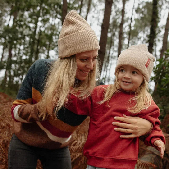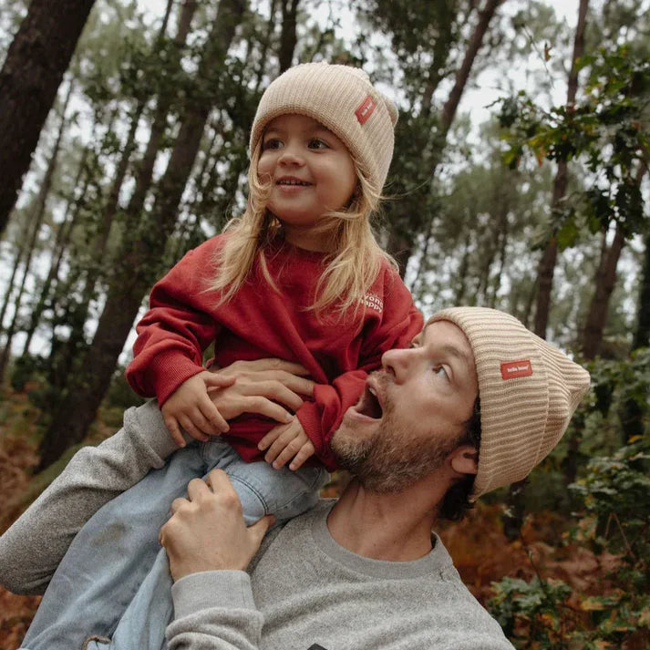 On adore le Bonnet pour enfants et bébés, Flow Creamy. 100% coton bio, sans pompon, revers large. À porter en famille, parfait pour l’automne-hiver. Ne vous le faites pas chiper !