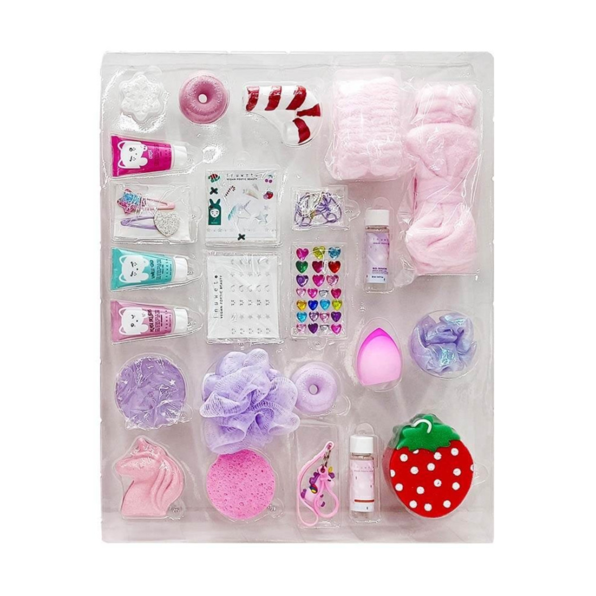Ce calendrier contient des articles variés comme des gels douche, des accessoires de beauté et des stickers. Idéal pour les amateurs de cosmétiques, il offre une expérience festive et ludique tout au long du mois de décembre.