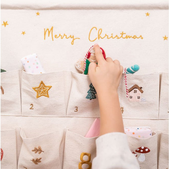Ce calendrier, orné de poches numérotées et délicatement brodées, transforme le compte à rebours en un moment ludique et captivant.