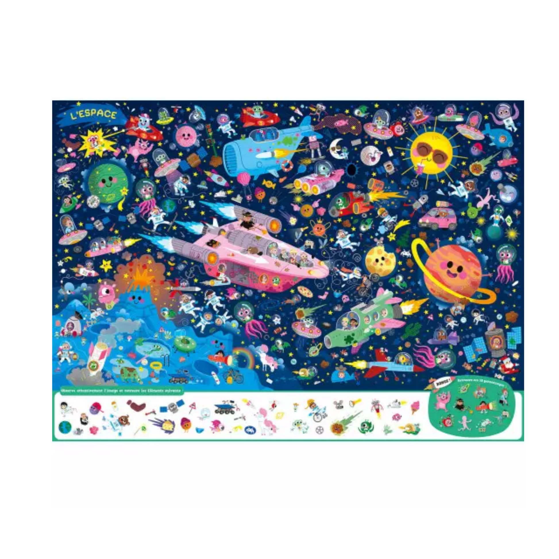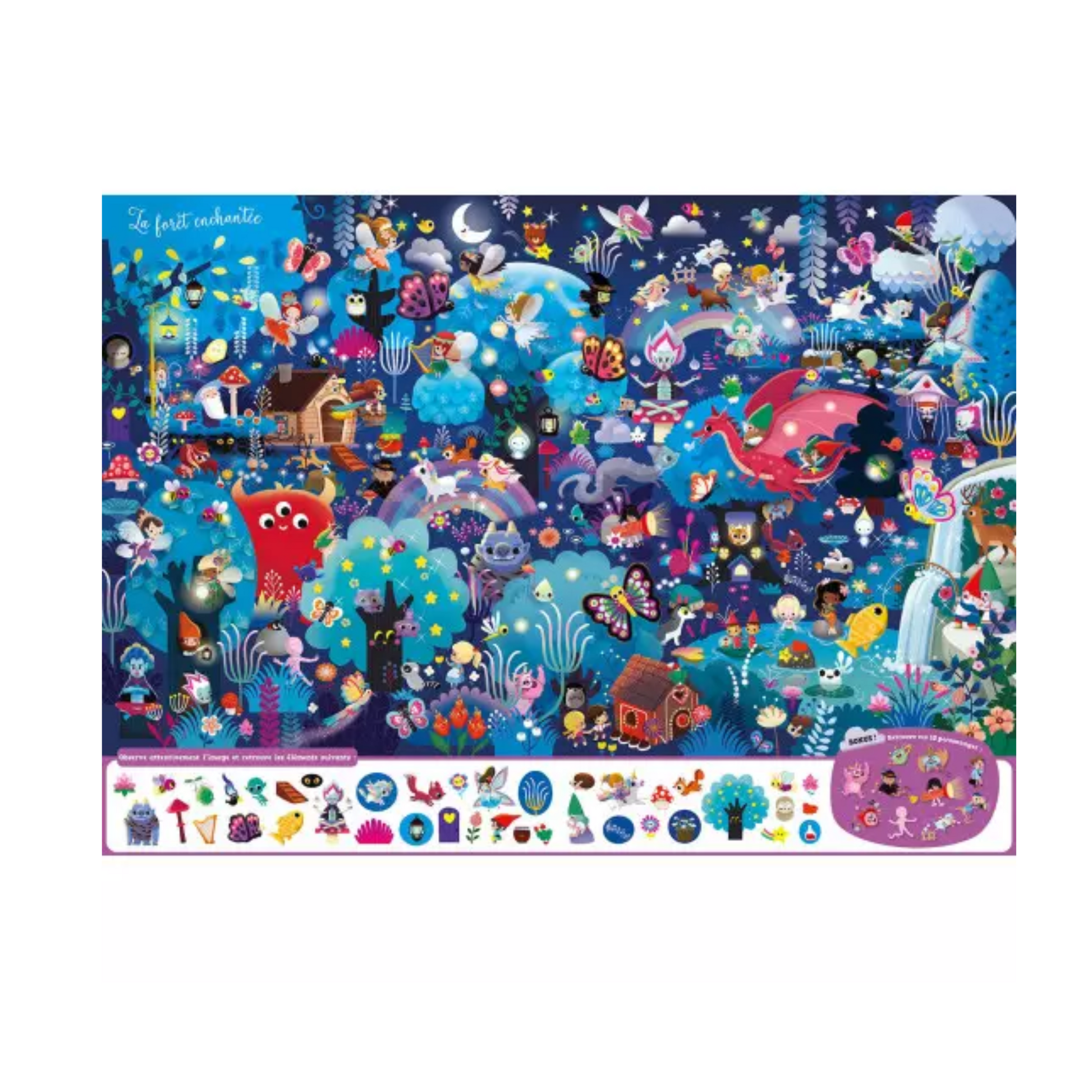 Un album tout carton avec cinquante éléments, dont dix personnages récurrents, à retrouver au sein de neuf univers détaillés avec des illustrations phosphorescentes : l'espace, les robots, au fond de la mer, la forêt enchantée, la chambre, la nuit dans un musée, la ville, les feux de camp, les fonds marins, entre autres.