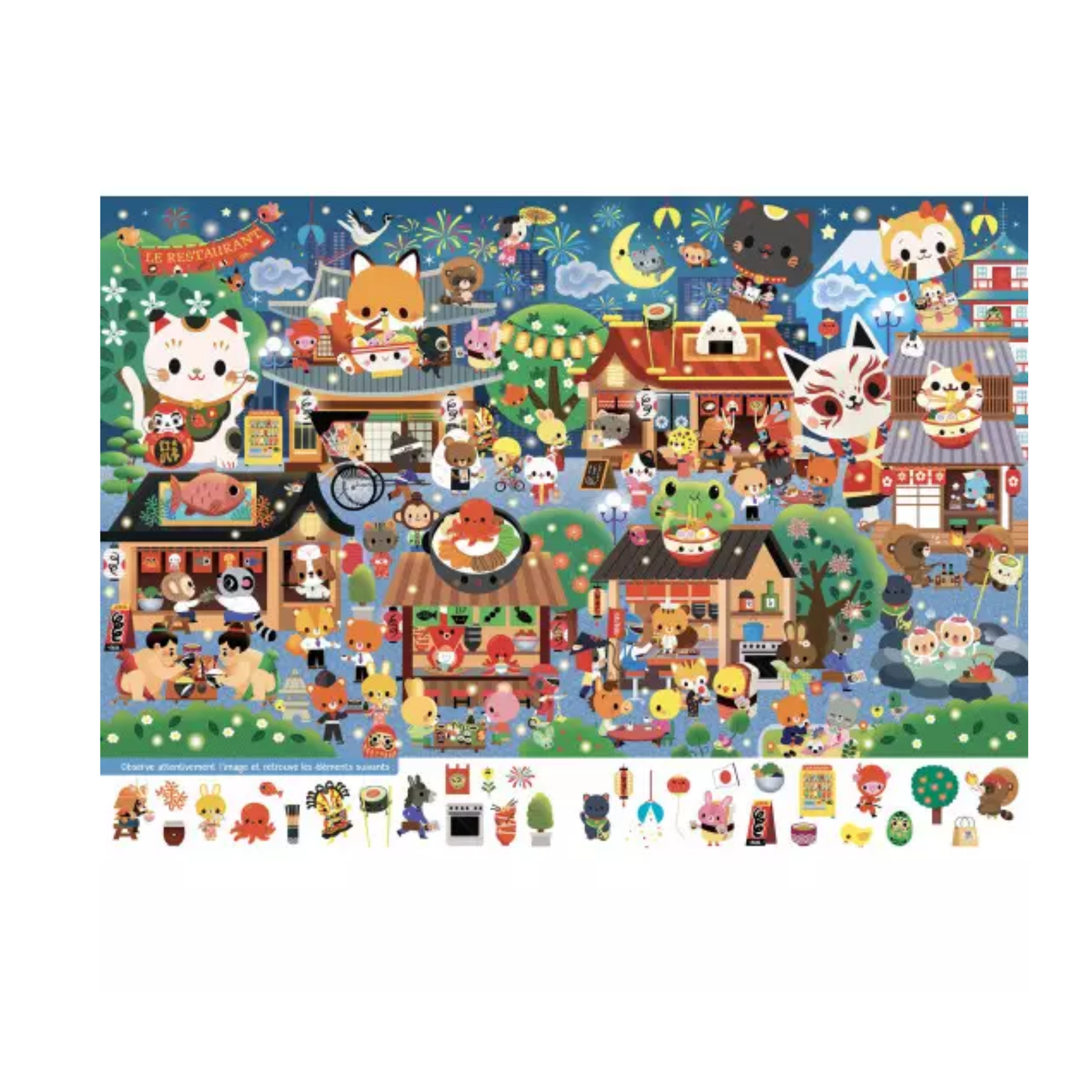 Plus de 400 éléments à retrouver, seul ou à plusieurs, dans quatorze illustrations colorées inspirées du style kawaii.