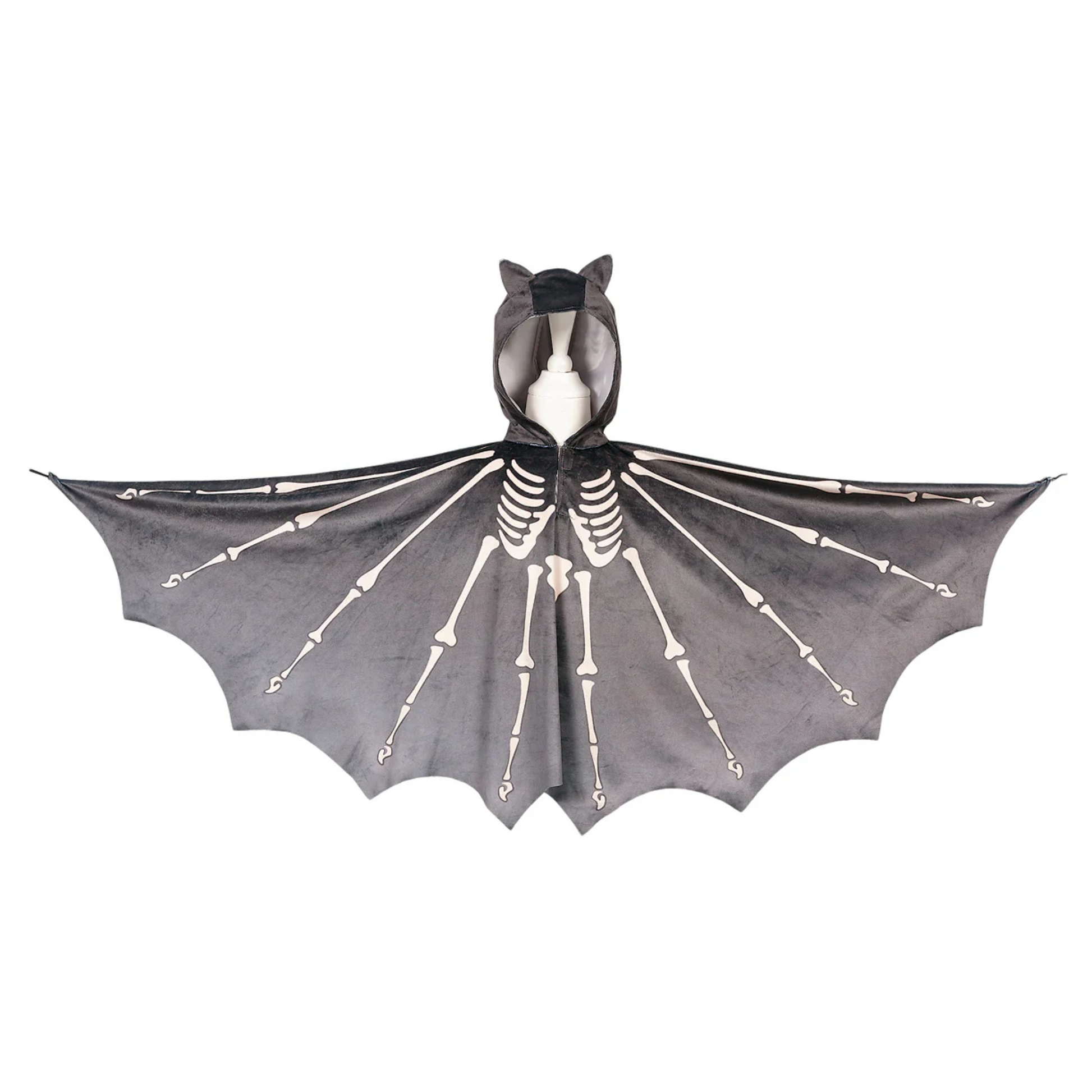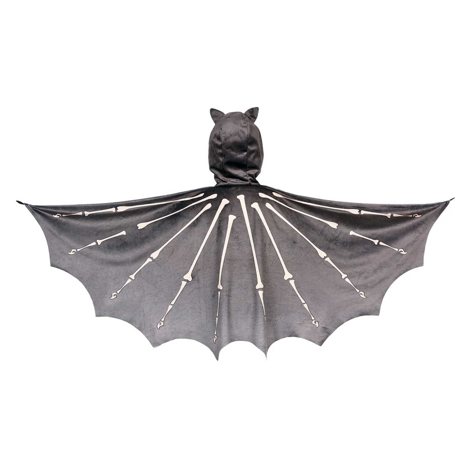 Elle est confectionnée dans un tissu léger, souvent en tulle ou velours sombre, orné de motifs squelettiques ou de chauves‑souris scintillantes. Agrémentée d’une capuche douce avec de petites oreilles, la cape se fixe facilement au cou et propose une découpe irrégulière rappelant les ailes de cet animal nocturne.