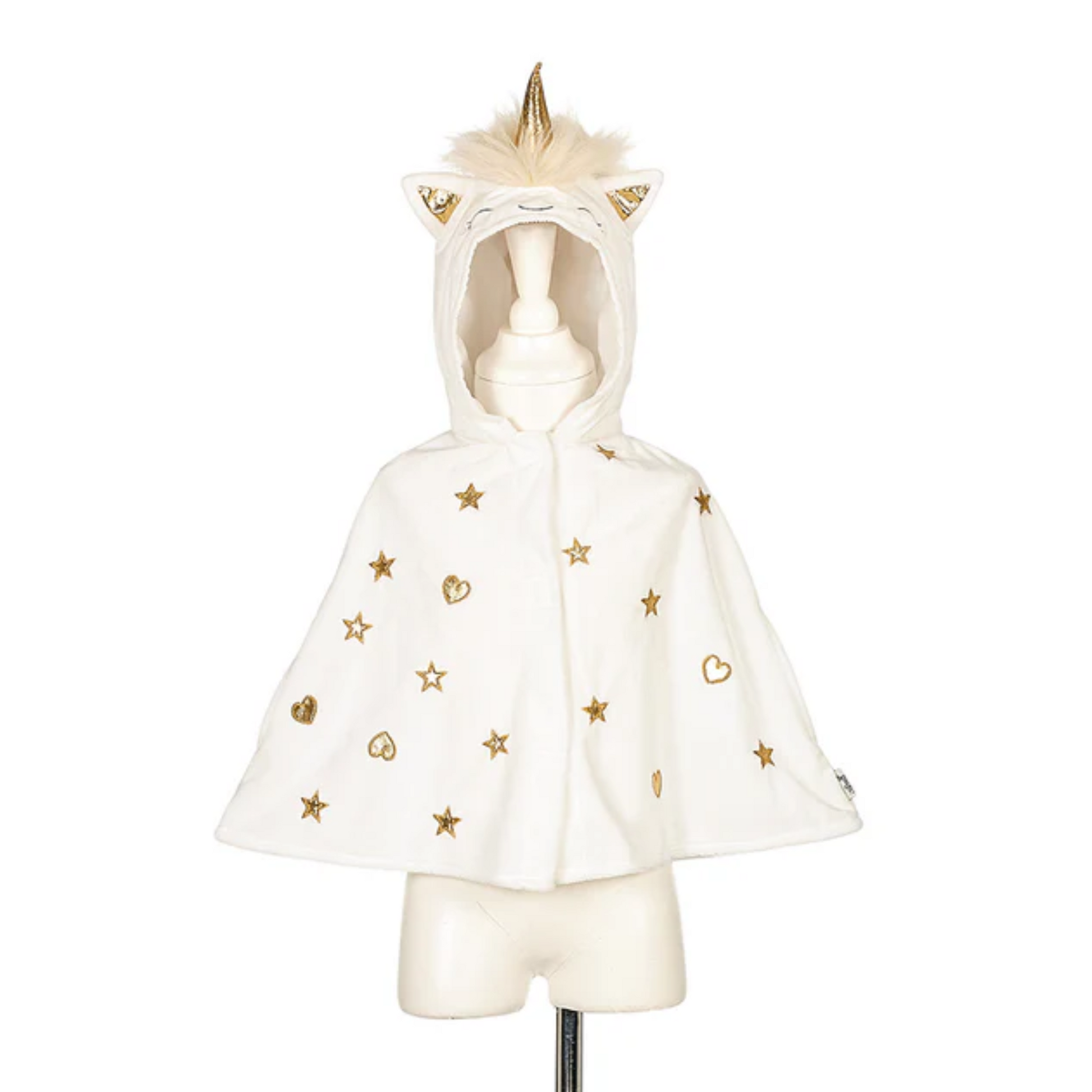 De couleur blanc cassé, la cape est ornée d’une capuche délicate équipée d’une corne dorée scintillante, de petites oreilles mignonnes et d'une crinière douce qui cascade joliment sur le dos. Les motifs au design raffiné, comme des cœurs ou des étoiles dorées, apportent une touche enchantée et élégante.