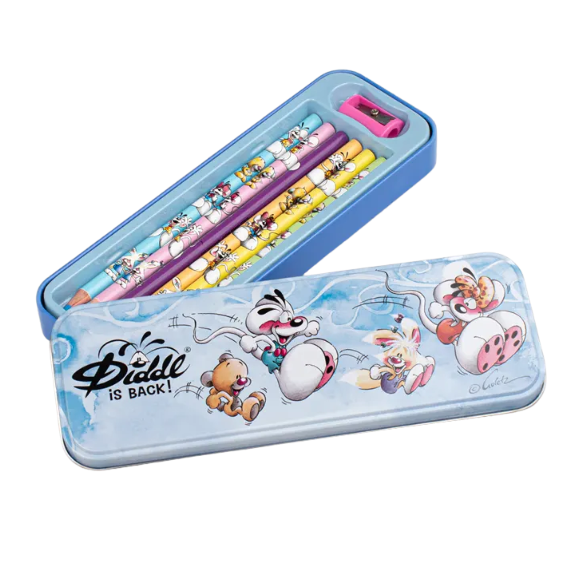 Ce coffret métallique collector vous accompagne partout. Avec ses 6 crayons de couleur, Diddl vous permet de réaliser des dessins éclatants et pleins de bonne humeur.