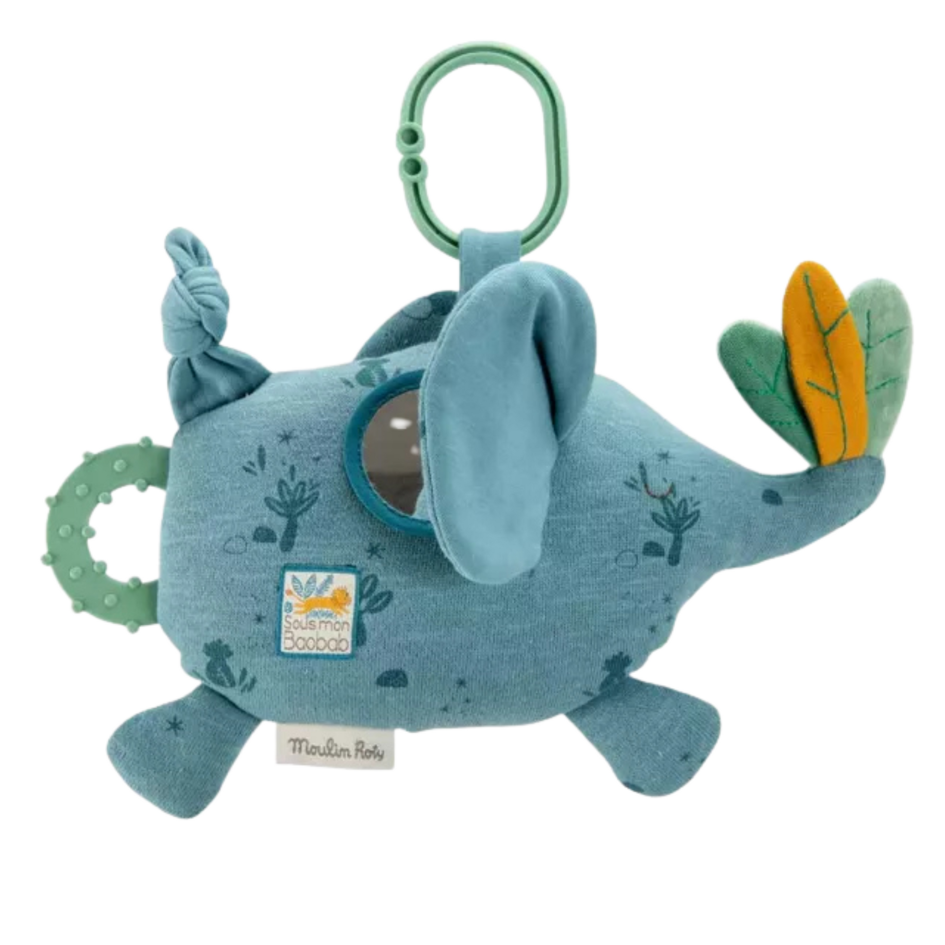 Il offre plusieurs stimulations sensorielles : une clochette cachée dans son ventre, un miroir discret, des feuilles bruissantes au bout de la trompe et un anneau de dentition.