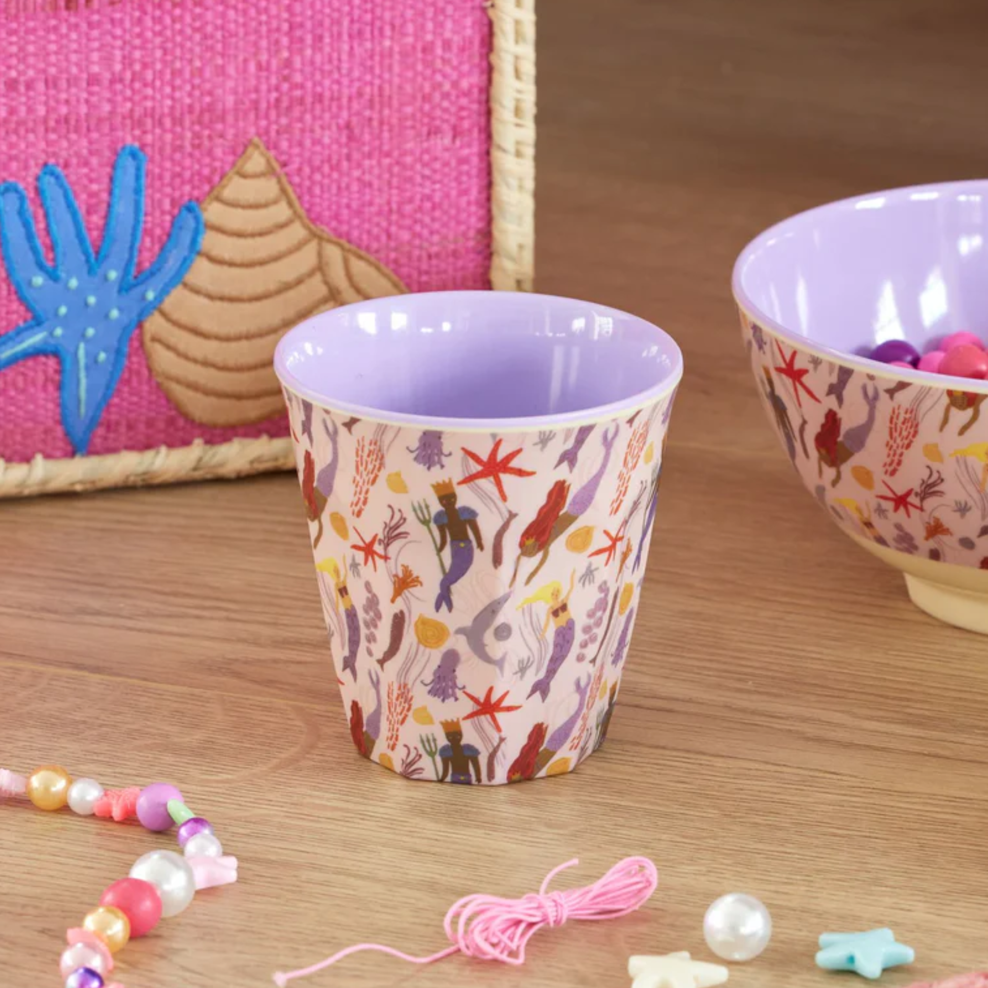 Notre fameux gobelet en mélamine, imprimé « Sirènes ». Tellement pratique, tout le monde peut l’utiliser, et de tellement de manières différentes – pour les boissons, ranger les crayons, en pique-nique… Les seules limites sont celles de votre imagination.