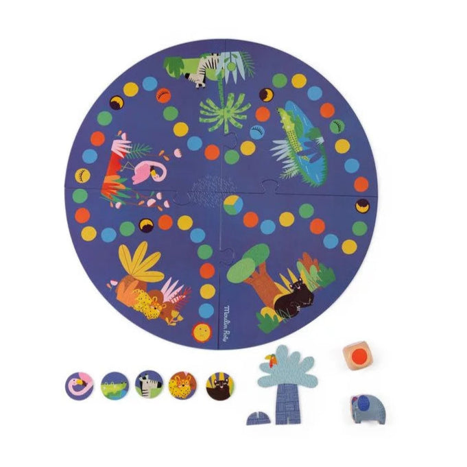 Le jeu contient 1 plateau illustré, 1 dé et 5 jetons animaux.
