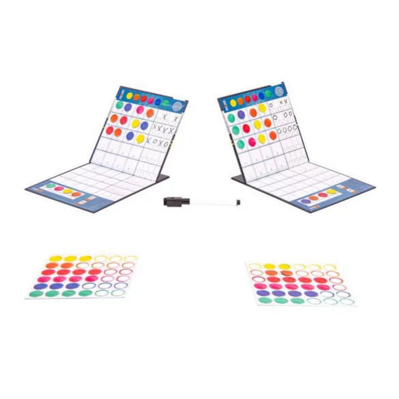 Le jeu comprend deux plateaux aimantés, un crayon effaçable et des magnets de six couleurs différentes.