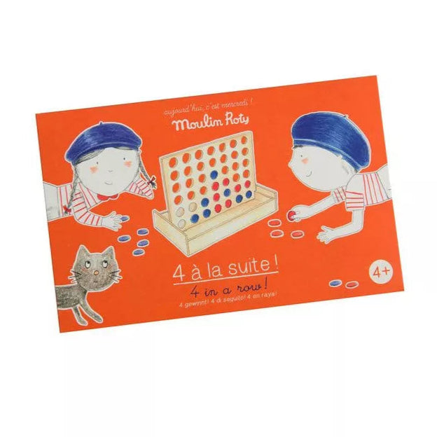 Découvrez le jeu de 4 à la suite de la collection Aujourd'hui c'est mercredi signée Moulin Roty, une réinterprétation en bois d'un classique intemporel. Deux joueurs s'affrontent pour être les premiers à aligner 4 jetons de la même couleur.