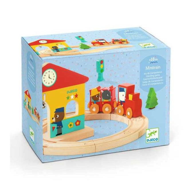 Le jeu de manipulation Minitrain de Djeco propose un premier circuit de train en bois adapté aux enfants dès 18 mois.