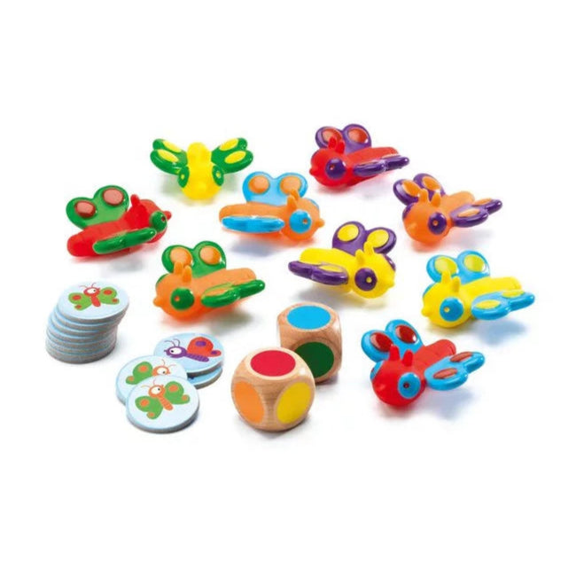 Le jeu se compose de : 9 papillons en plastique, 2 dés, 30 jetons à gagner et la règle de jeu.
