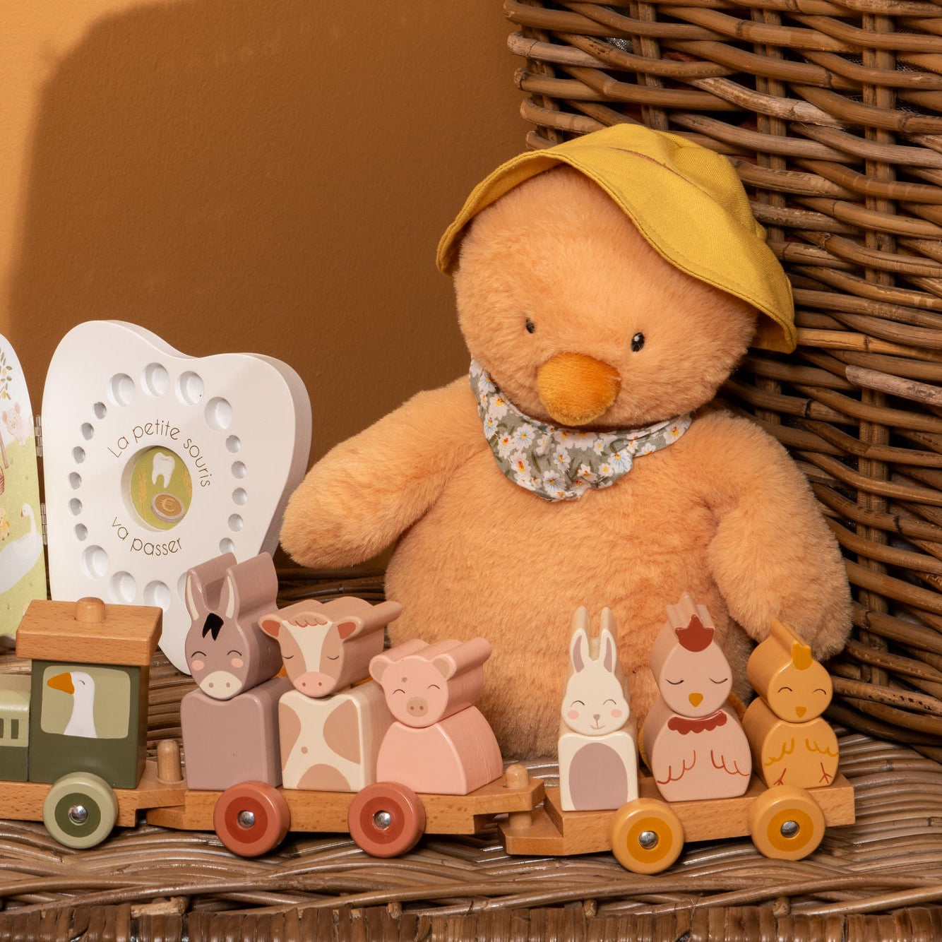 Justin le poussin est une peluche conçue spécialement pour les enfants, alliant douceur et sécurité.