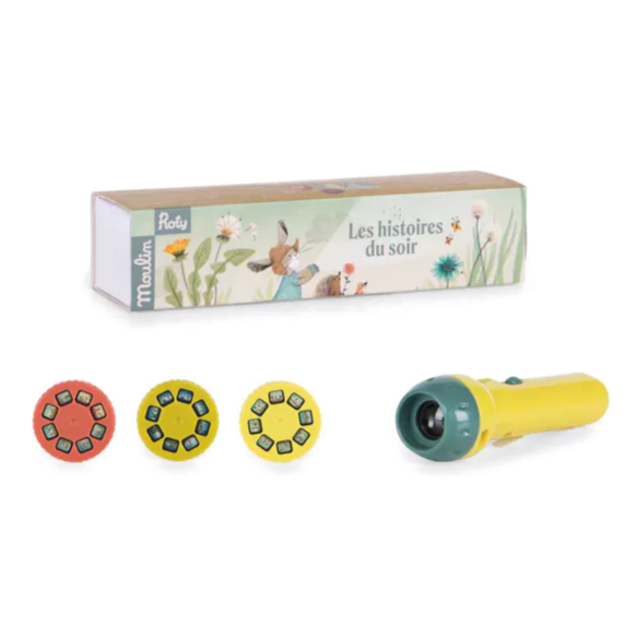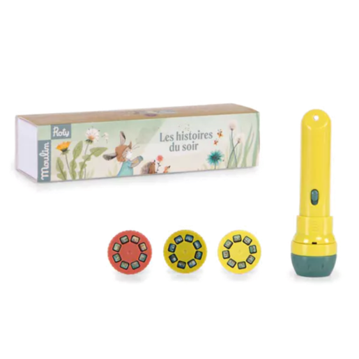 Découvrez la lampe à histoires de la collection Trois petits lapins de Moulin Roty, une lampe torche qui projette des images en couleurs pour raconter de jolies histoires à votre enfant.