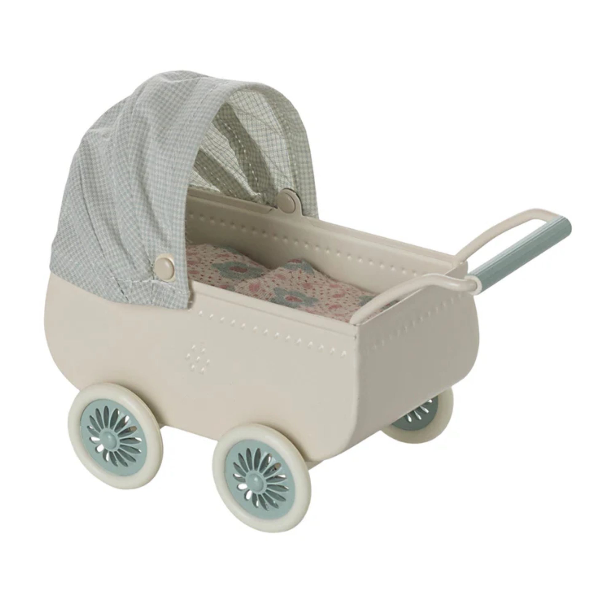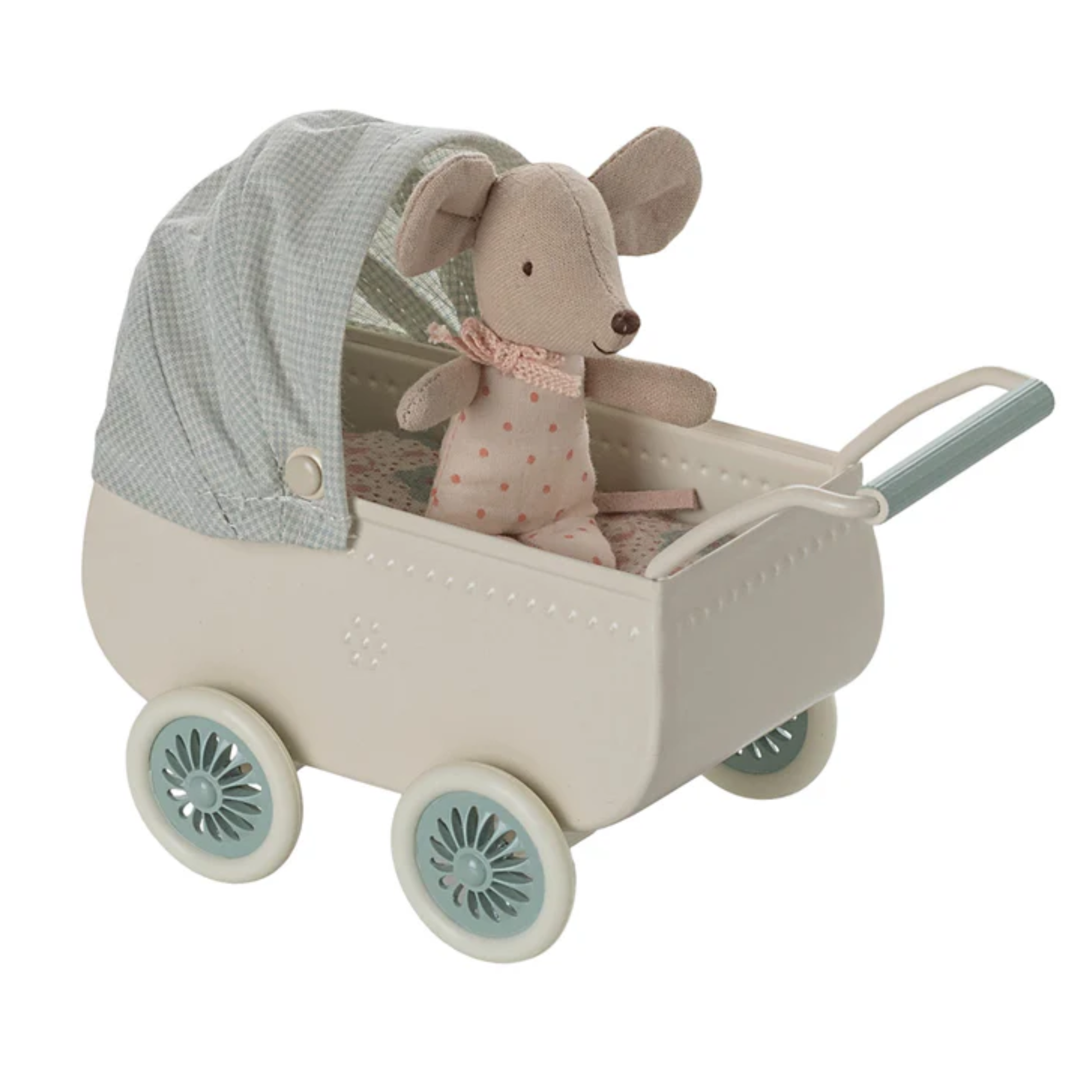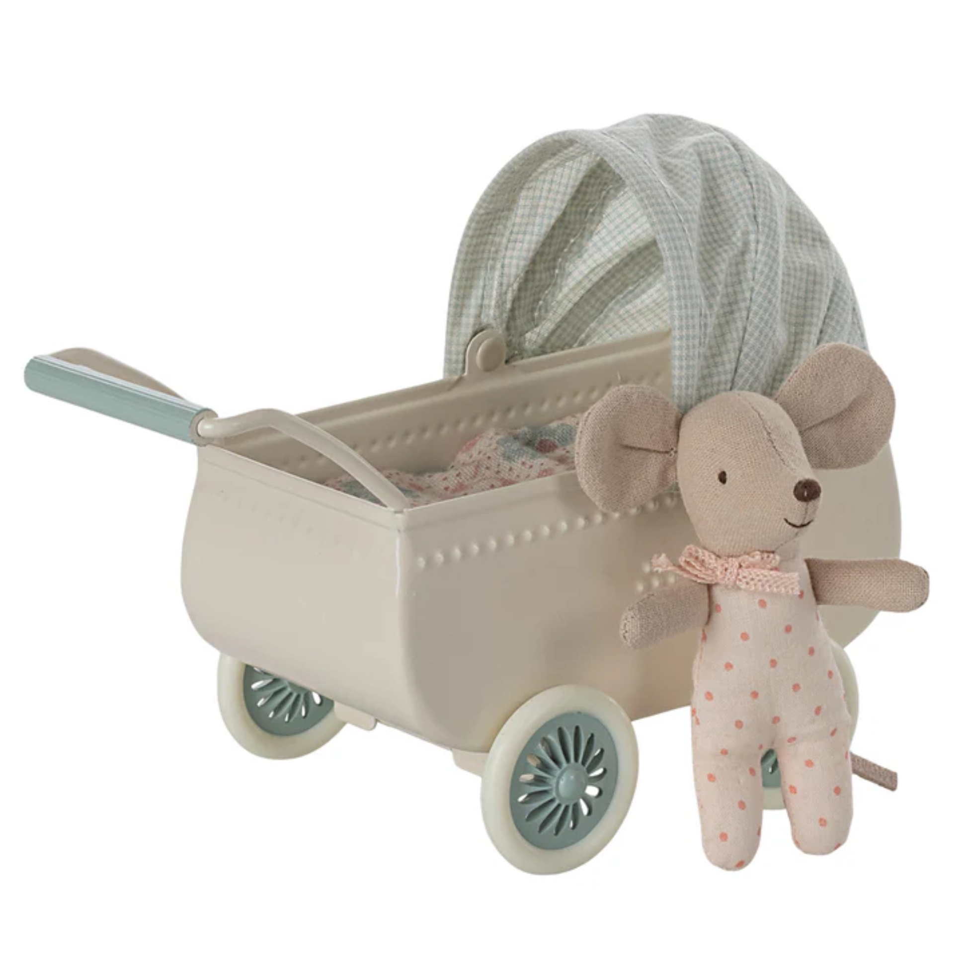Le landau Maileg au charme vintage est parfait pour les promenades aventureuses des bébés souris dans la chambre d’enfant.