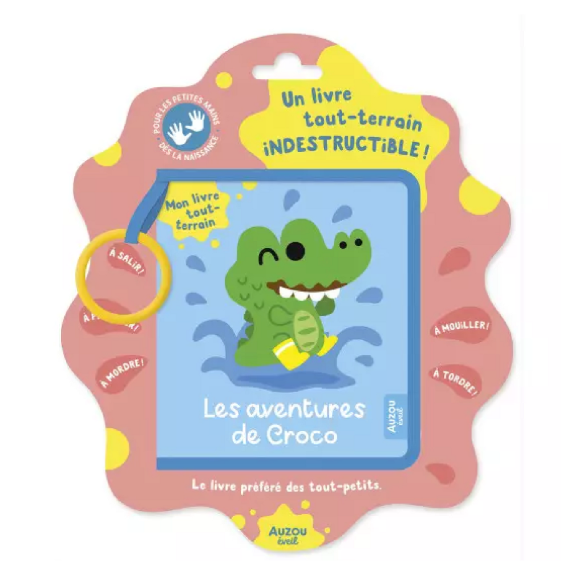 Les aventures toutes sales de Croco. Un livre en néoprène indestructible et facile à nettoyer, avec un anneau pour l'accrocher partout.