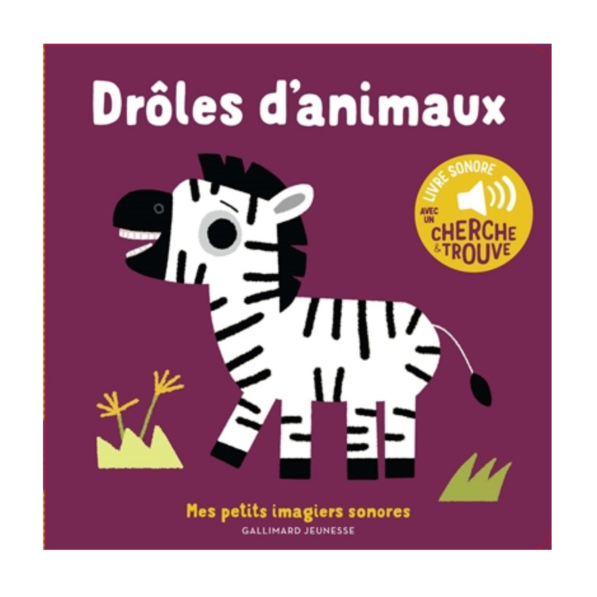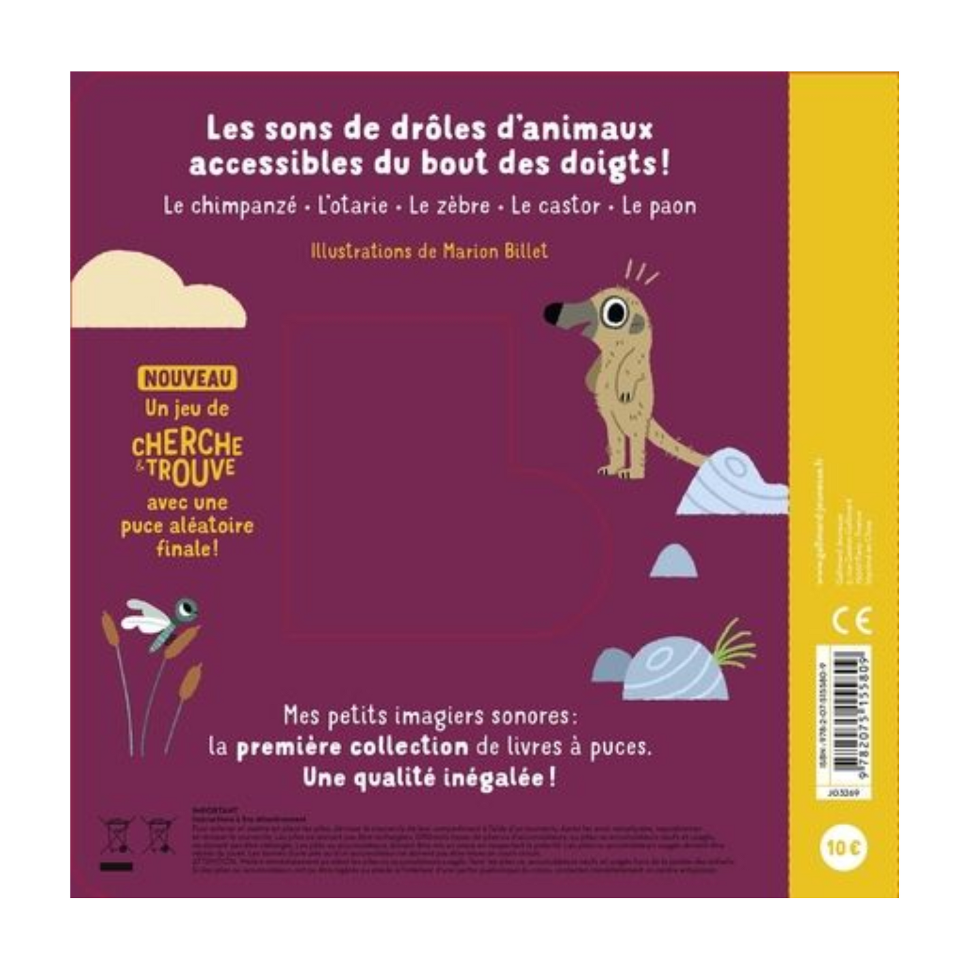 Un livre sonore pour découvrir le cri du zèbre, du singe, de l'otarie, du paon et du castor. Avec un cherche et trouve en fin d'ouvrage. La puce propose un son aléatoire et l'enfant désigne l'animal correspondant.