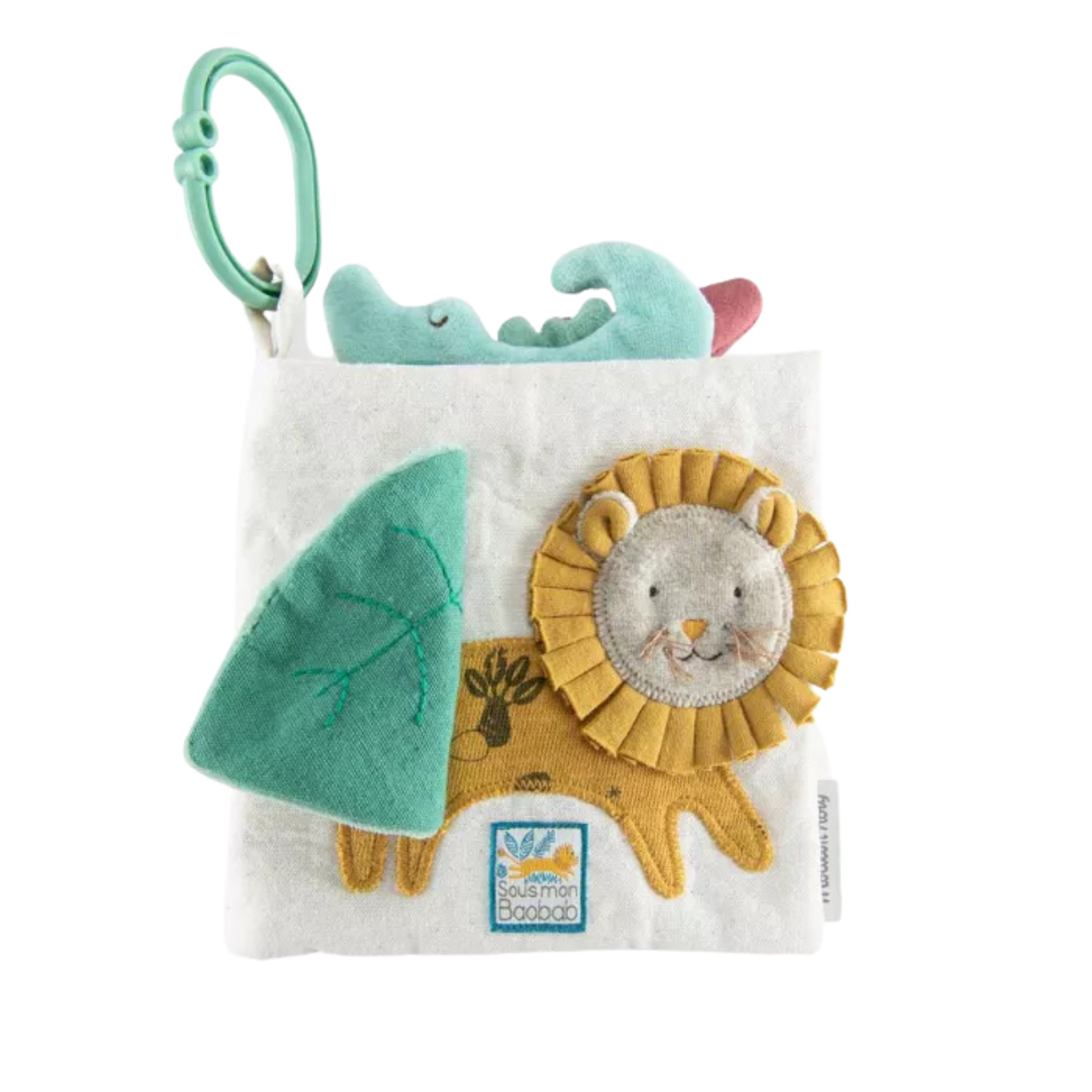 Explorez le livre d'activités en tissu de la collection Sous mon Baobab signé Moulin Roty, un compagnon nomade mêlant textures variées et couleurs attrayantes.