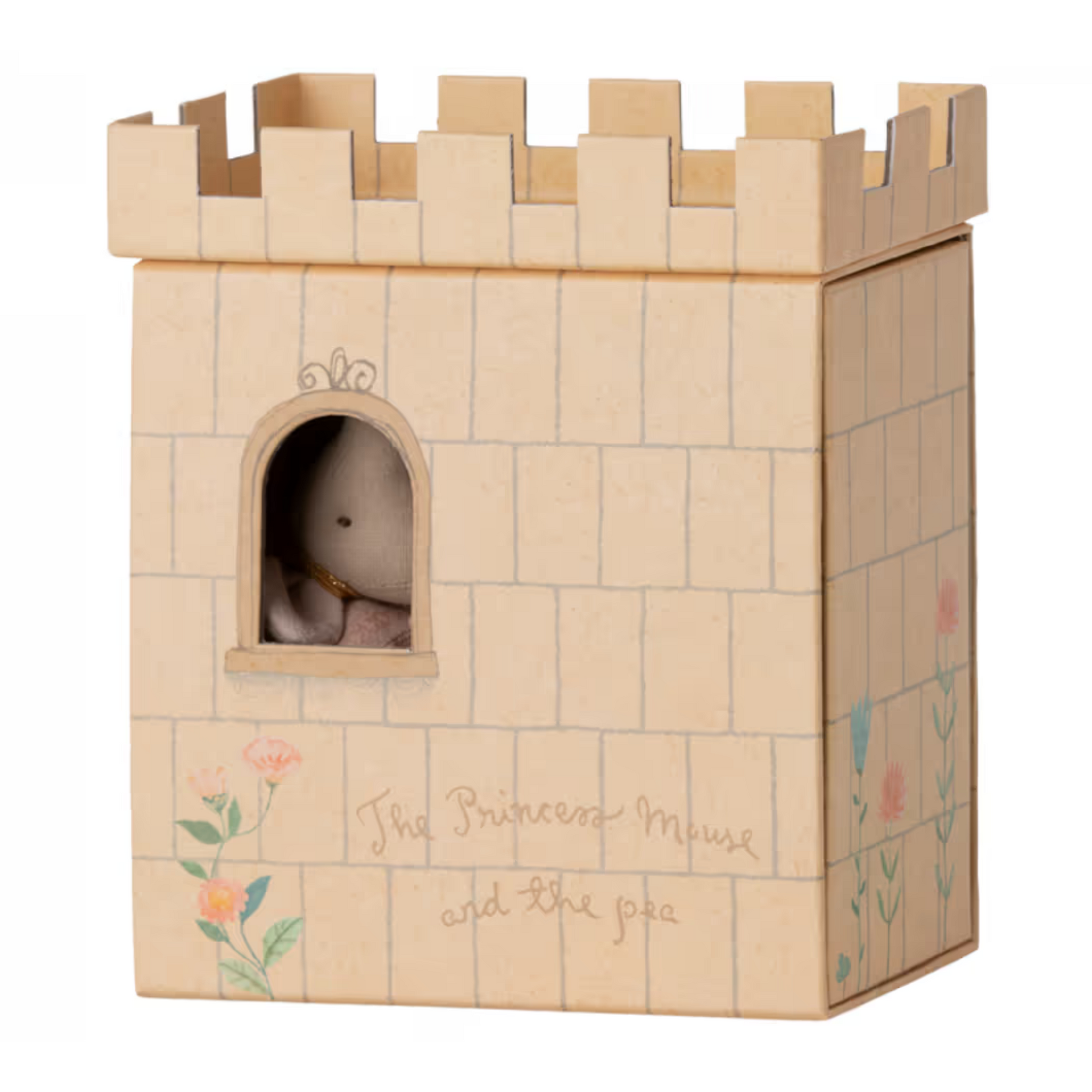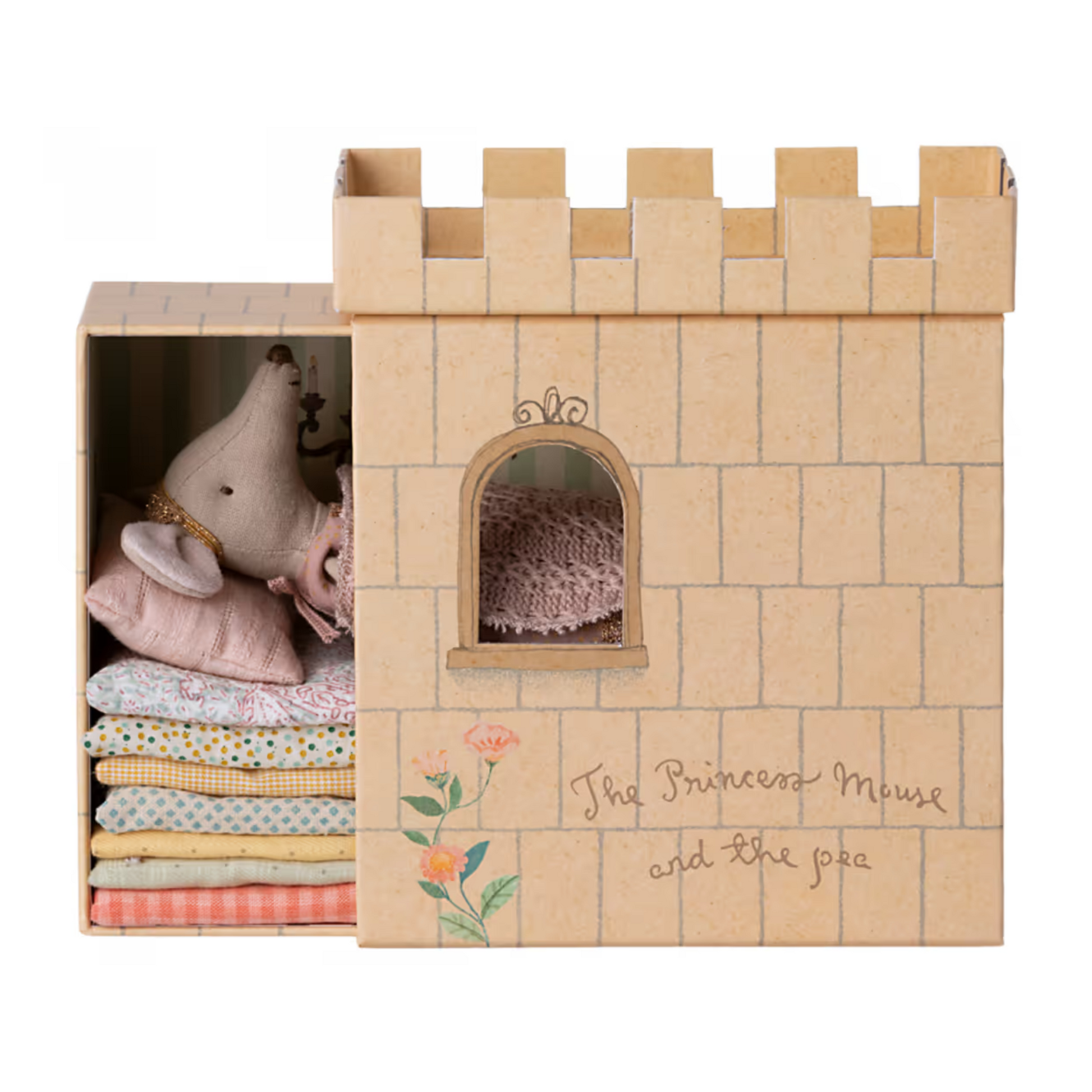 Cette mignonne souris est déguisée en princesse du petit pois. Elle dort gentiment dans son lit haut et comprend un château, des matelas et un petit pois.