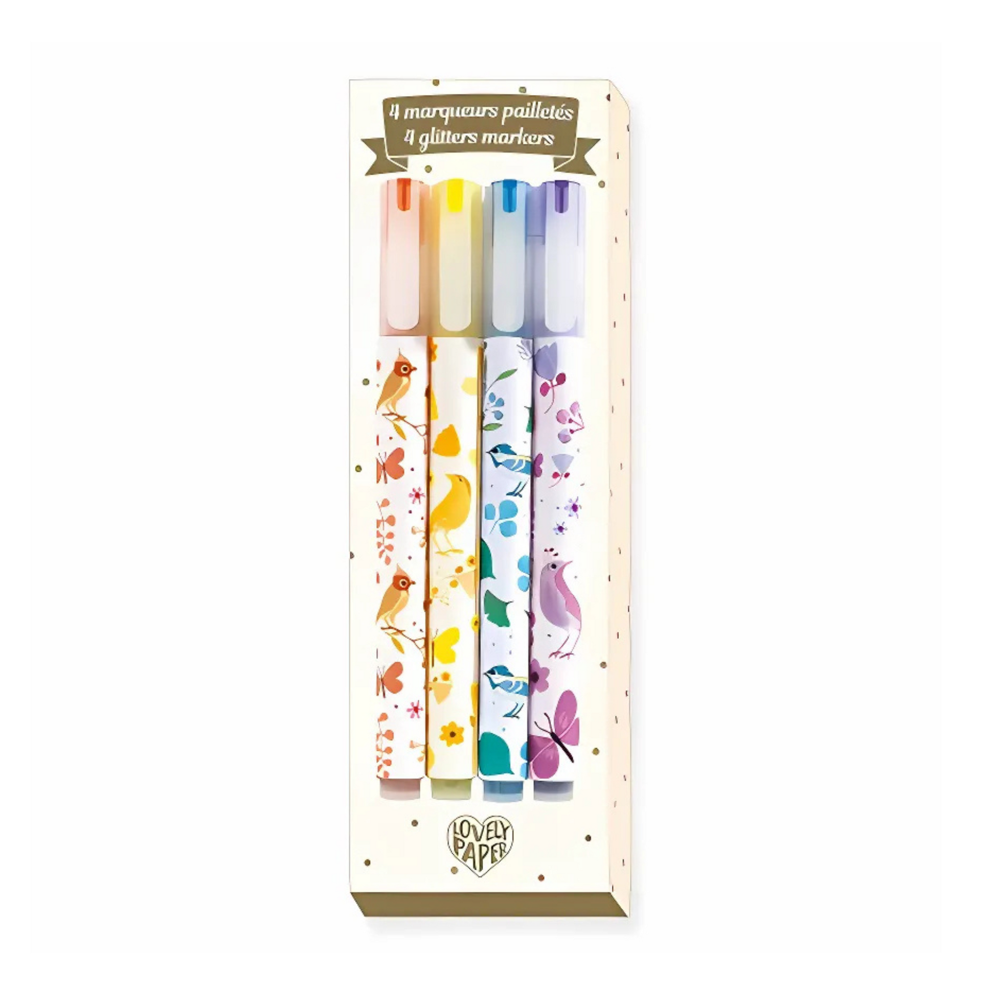 Les marqueurs scintillants Tinou de Lovely Paper by Djeco se présentent en un coffret compact comprenant quatre couleurs pailletées : jaune, orange, bleu et violet.