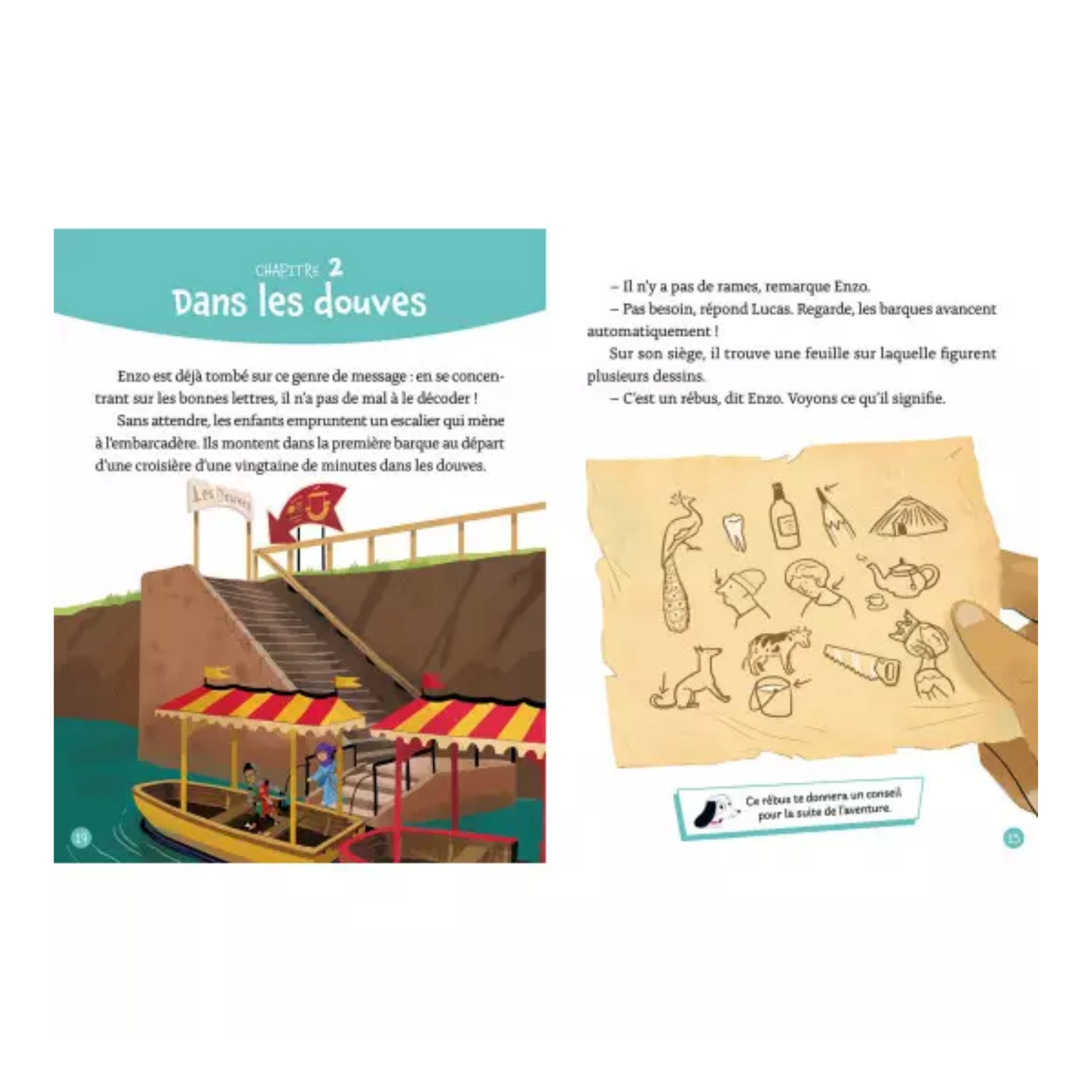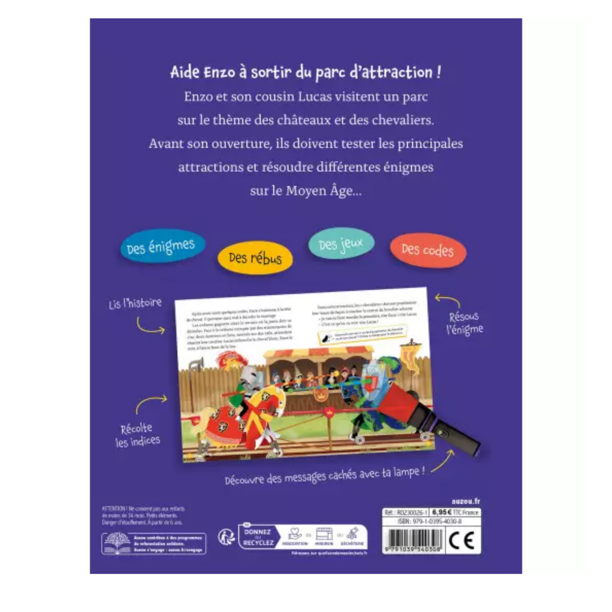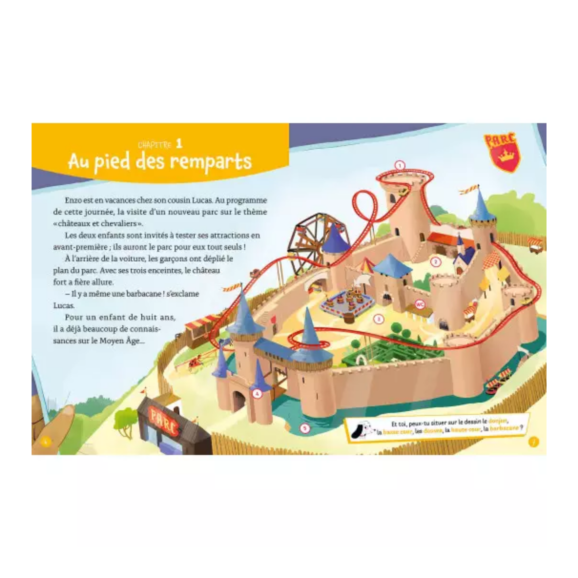 Enzo et son cousin Lucas visitent un parc sur le thème des châteaux et des chevaliers. Un récit parsemé d'énigmes sur le Moyen Age à résoudre.