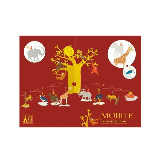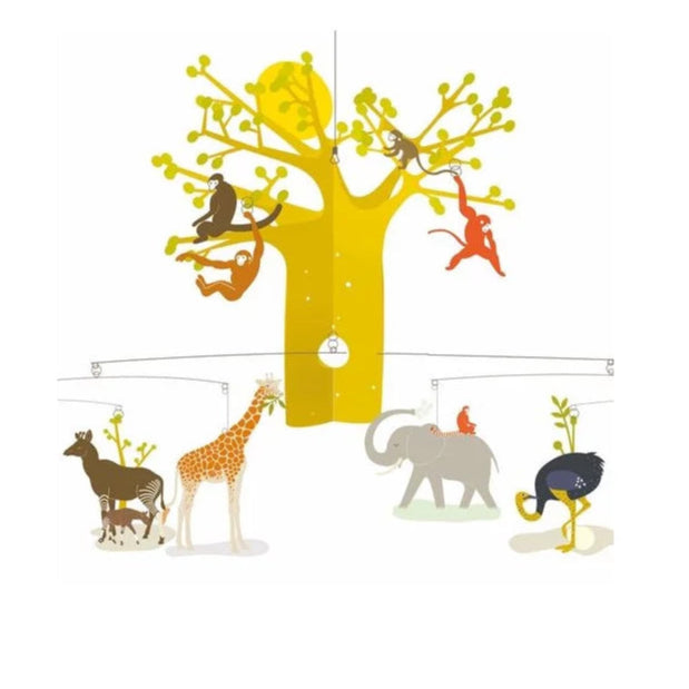 Djeco présente son mobile « La savane africaine », un modèle impressionnant mettant en scène un baobab entouré des animaux emblématiques de la savane.