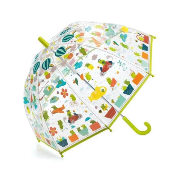 Plongez dans la fraîcheur de la pluie avec le parapluie Grenouillettes de Djeco, un chouette parapluie transparent décoré de jolies petites grenouilles colorées.