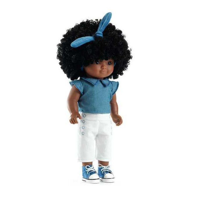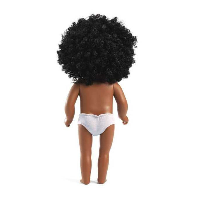 Le coffret contient 1 poupée fille vinyle aux cheveux courts crépus, 1 chemise manches courtes, 1 pantalon, 1 culotte, 1 bandeau foulard et des baskets.