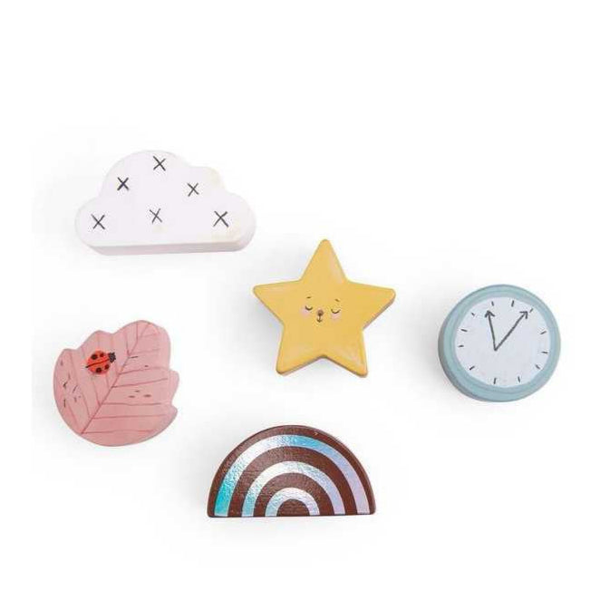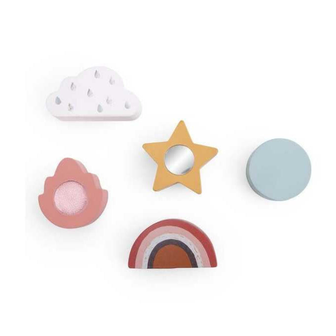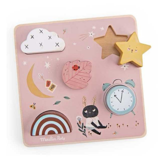 En soulevant chaque pièce illustrée, votre enfant expérimentera différentes textures. Il pourra manipuler des formes variées : une étoile, un arc-en-ciel, un nuage, une feuille et un réveil.