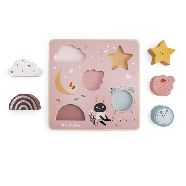 Explorez le puzzle sensoriel de la gamme Après la pluie par Moulin Roty, un jeu en bois de 5 pièces à encastrer, adapté aux enfants dès 1 an.