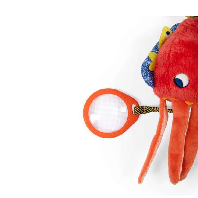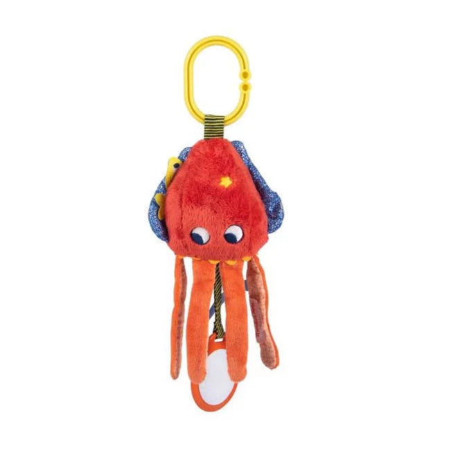 Facile à accrocher à la poussette, à une arche d’activités ou au parc, ce mollusque en tissu accompagne votre enfant au quotidien.