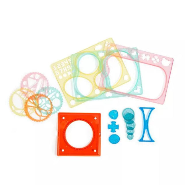 Ce coffret comprend 3 grands cadres à formes avec un réducteur, 8 petites roues dentelées, un cadre carré et 4 grandes roues dentelées.
