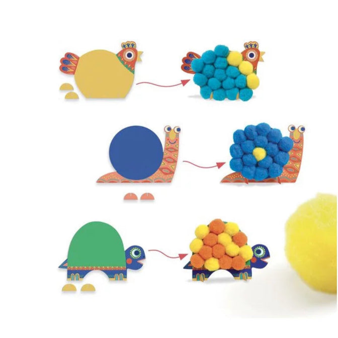 En collant de gros pompons colorés sur les zones adhésives des trois animaux — une poule, un escargot et une tortue — les petits créeront des compagnons tout doux et joyeux.