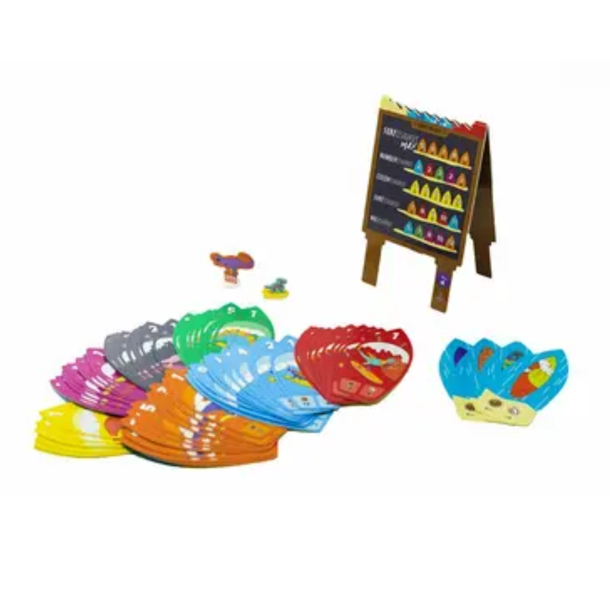 Surfosaurus Max est un jeu semi-coopératif avec 7 séries de dinos numérotés de 1 à 12. Lors d’une manche, les joueurs posent juste 2 ou 3 cartes devant eux, en tentant de sentir l’alliance la plus prometteuse... car à la fin, seules les cartes qui forment la meilleure combinaison de 4 ou 5 cartes seront gagnées ! Suspense garanti !