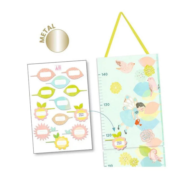 Découvrez la toise Printemps de Djeco, une grande toise murale aux couleurs du printemps avec de jolies fleurs et des illustrations scintillantes aux reflets métallisés.