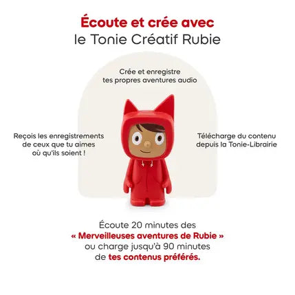 En configurant votre Toniebox 2, ajoutez jusqu'à 90 minutes de contenu audio personnalisé sur votre Tonie Créatif Rubie inclus dans le coffret et accédez à plus de 10H de contenus gratuits, à télécharger directement via l'application tonies®.