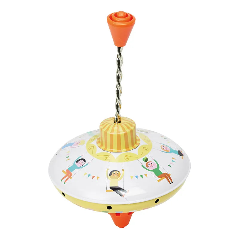 Cette toupie en métal tourne lorsqu'on pousse sur le levier. Elle se met alors à tourbillonner, entraînant les animaux et les personnages dans une folle danse qui fascinera votre enfant. La toupie reste en équilibre et s'arrête au bout de quelque temps. Ce jouet intemporel ravira les petits et les plus grands.