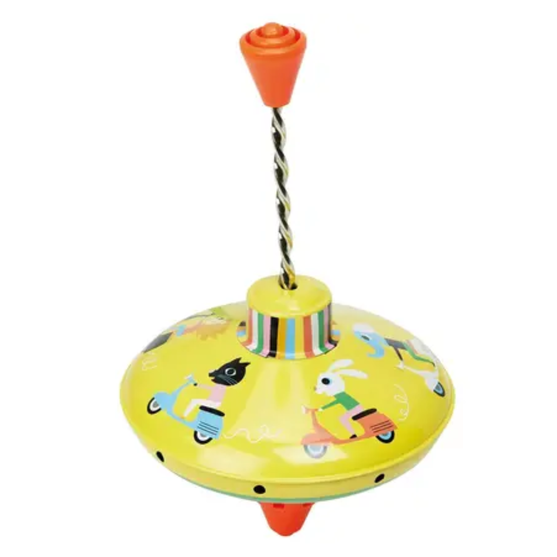 Cette toupie en métal tourne lorsqu'on pousse sur le levier. Elle se met alors à tourbillonner, entraînant les animaux et les personnages dans une folle danse qui fascinera votre enfant. La toupie reste en équilibre et s'arrête au bout de quelque temps. Ce jouet intemporel ravira les petits et les plus grands.