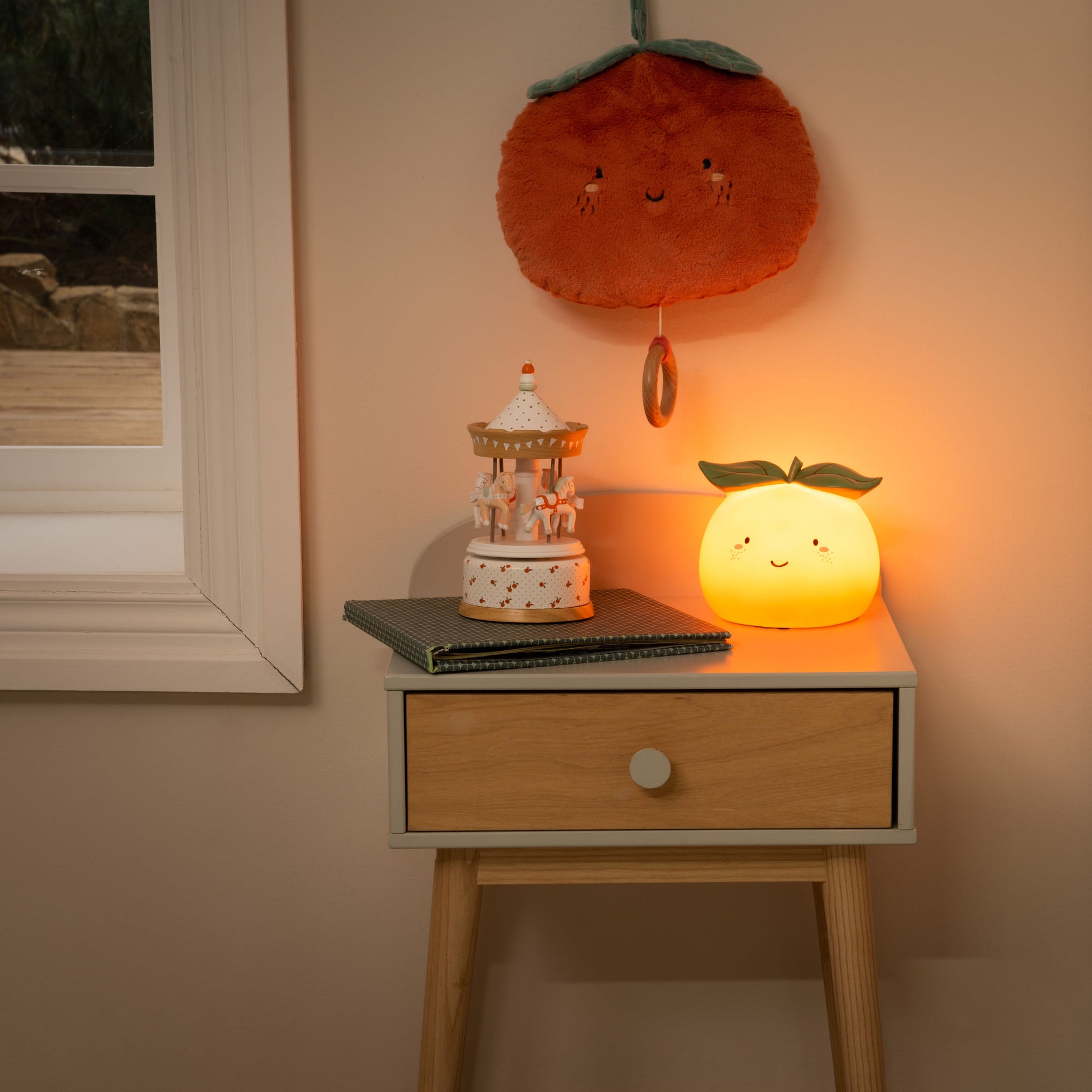 Cette veilleuse orange, conçue spécialement pour les chambres d’enfant, fonctionne sur piles pour une utilisation simple et sécurisée sans fil.