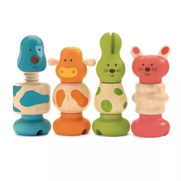 L’enfant choisit une vis avec la tête d’un lapin, chien, chat ou vache, puis associe le corps et la base de la même couleur pour les assembler. Une fois montés, les petits animaux deviennent des compagnons de jeu, et l’enfant peut aussi s’amuser à les mélanger.