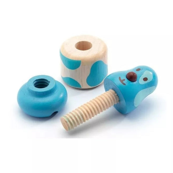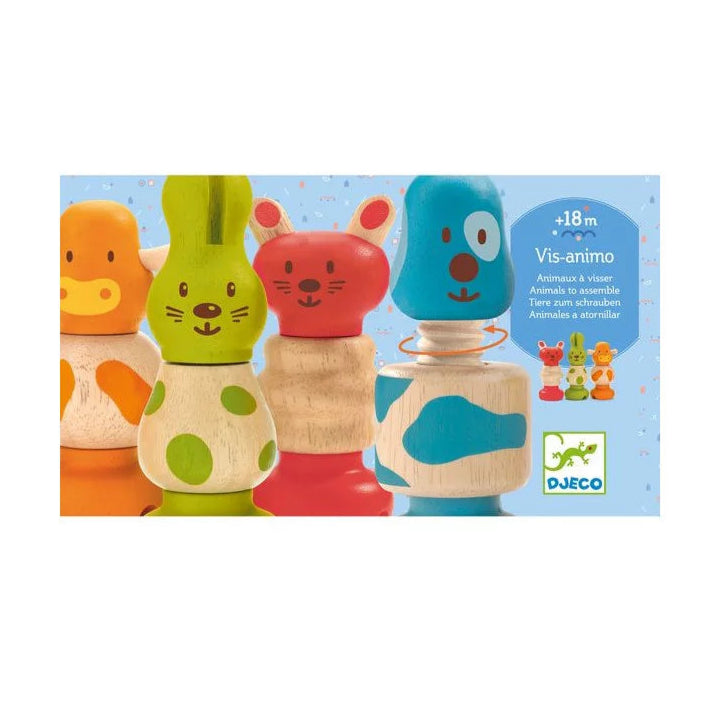 Découvrez Vis-animo de Djeco, un jeu éducatif ludique avec 4 adorables animaux en bois à visser, parfait pour les enfants dès 18 mois.
